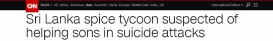25日,斯里蘭卡警方發(fā)言人稱,香料大亨穆罕穆德易卜拉欣因涉嫌協(xié)助和教唆他的兒子發(fā)動自殺式襲擊而被捕。報道還稱,易卜拉欣的兩個兒子伊姆薩特艾哈邁德易卜拉欣和伊勒姆艾哈邁德易卜拉欣都是此次斯爆炸案中的自殺式襲擊者。