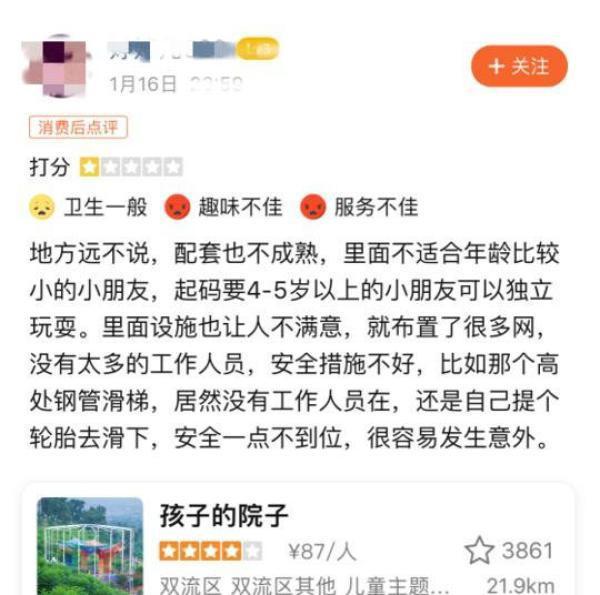 實(shí)際上,網(wǎng)上關(guān)于孩子的院子的質(zhì)疑有不少,某知名點(diǎn)評網(wǎng)站上就有不少差評,設(shè)備簡陋、安全人員不到位、項(xiàng)目危險度高等三項(xiàng)質(zhì)疑頻繁出現(xiàn)。5月1日上午的時候,該網(wǎng)站還能打開看到跟“孩子的院子”相關(guān)的購買信息和評論,到下午的時候,該網(wǎng)站跟“孩子的院子”樂園相關(guān)的信息全部刪除了,無法打開。