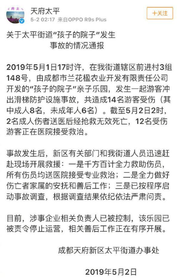 @中國之聲 5月2日報道,5月1日,小長假的第一天,位于成都天府新區(qū)太平鎮(zhèn)的一家名為“孩子的院子”的游樂園,發(fā)生了一起游客沖出滑梯防護(hù)設(shè)施事故。事故造成2名成人傷者送醫(yī)后搶救無效死亡,其他12名受傷游客正在醫(yī)院接受救治。目前,涉事負(fù)責(zé)人已被控制,游樂場已暫停營業(yè)。