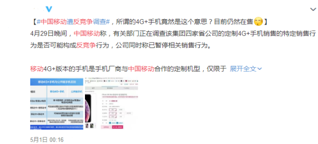因為移動的定制4G+雙卡雙待手機,只能是使用移動就是4G,而使用其他的運營商,就只有2G和打電話了。隨后國家方面出手了,市場監(jiān)督管理局,也是正在調查中國移動這種行為,是否構成了反競爭。而移動方面也是表示,已經(jīng)暫停相關的業(yè)務了。不過這個暫停,并不是說這種4G手機不賣了,而是說暫停這種行為。