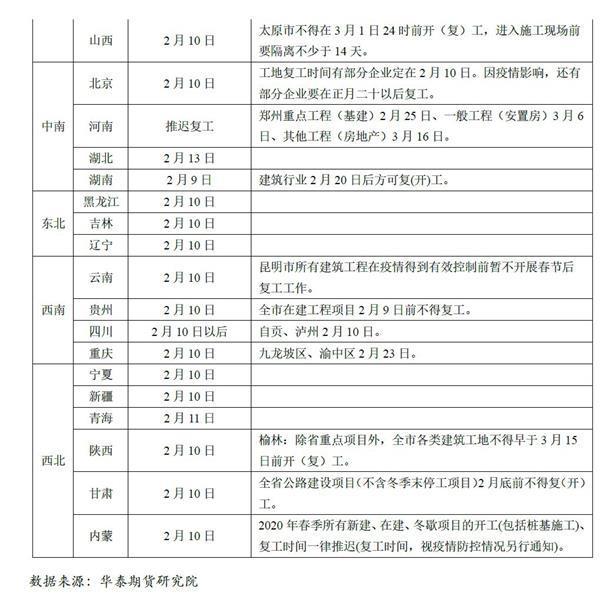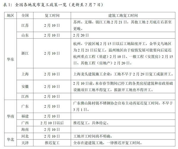 目前疫情拐點(diǎn)不明,工人返城條件依然不佳,在全國各地管控措施未放松的情況下,建筑工程的復(fù)工,仍需時(shí)日。根據(jù)華泰對杭州、北京、廣州等地的電話調(diào)研,以及整理了全國各地的復(fù)工政策整理,我們預(yù)計(jì),在疫情不再擴(kuò)展的情況下,全國建筑工程較往年平均推遲3周開工。