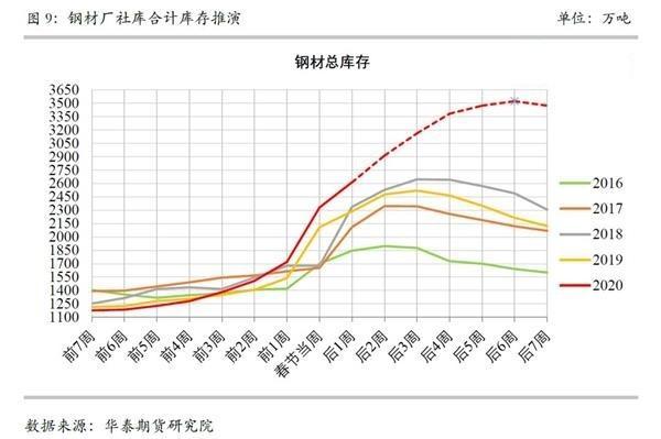 保守估計(jì),本次疫情整體推后工程消費(fèi)3周以上。如果按3周消費(fèi)延后計(jì)算,考慮部分不可停產(chǎn)的工業(yè)材消費(fèi),則每周保守估算,全國每周需額外增加鋼材庫存350-400萬噸左右,由此,今年庫存高點(diǎn)將創(chuàng)出歷史新高,并遠(yuǎn)高于近幾年同期水平。