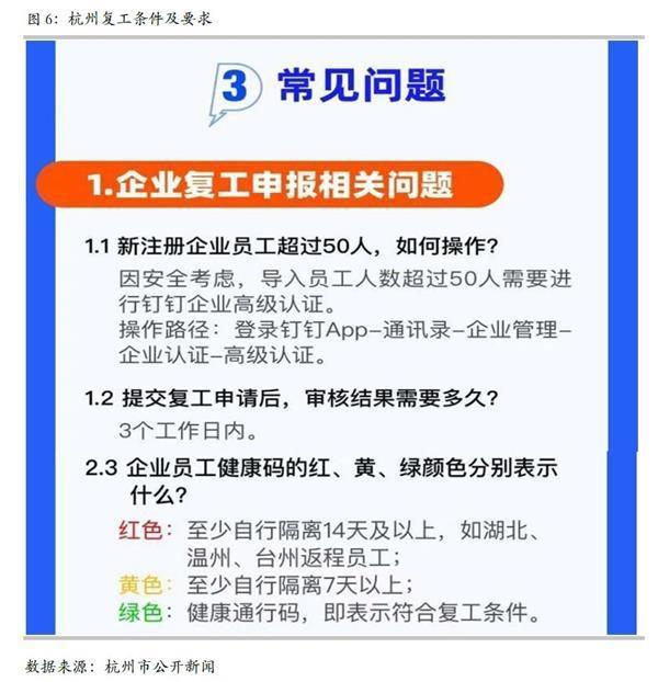 上述僅僅調(diào)研了政策規(guī)定的大體開復(fù)工日期,而實(shí)際的復(fù)工,仍有繁瑣的手續(xù)制約,比如杭州地區(qū)就發(fā)布了最新的復(fù)工條件。