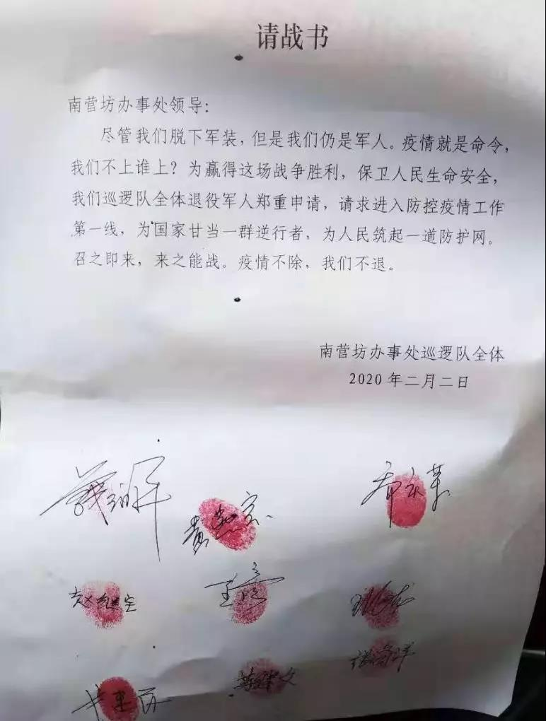 面對(duì)嚴(yán)峻的抗疫形勢(shì),危急時(shí)刻,南營(yíng)坊街道辦事處巡邏隊(duì)退伍軍人自愿寫下請(qǐng)戰(zhàn)書,簽下名字、按上手印,莊嚴(yán)請(qǐng)戰(zhàn)。