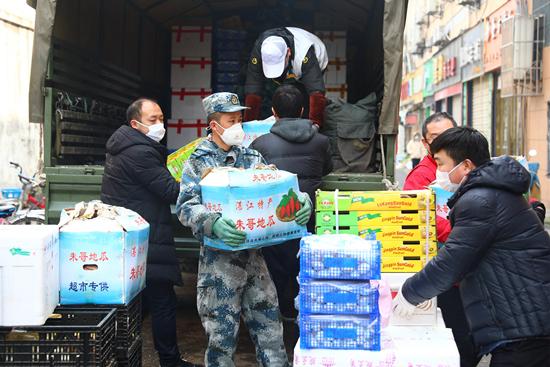在武漢秦園路店倉庫,看到軍車配送物資來了,超市負責人黃俊彪連忙招呼同事來幫忙。“我們店主要供應附近幾個小區(qū)的5000多名居民,平時每天一車貨就夠了。疫情發(fā)生后,蔬菜水果的需求量猛增,一車新鮮蔬菜水果,一上午就賣完了。多虧子弟兵,救了急?!秉S俊彪說。