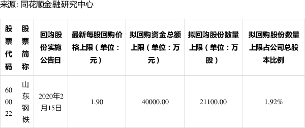 山東鋼鐵2月15日發(fā)布股份回購公告,公司擬于2020年2月15日至2021年2月6日完成本次公司股份回購計劃,本次回購價格不超過1.90元/股 ,回購總金額不超過人民幣40000.00萬元人民幣,若全額回購且按回購總金額上限和回購股份價格上限測算,預計可回購股份數(shù)量不超過21100.00萬股,擬回購股份數(shù)量上限占公司總股本比例為1.92%,具體回購股份的數(shù)量以回購期滿或終止回購時實際回購的股份數(shù)量為準?! ?/span>
