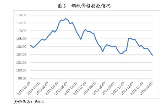 復產(chǎn)復工推遲、返程不暢、返程隔離措施導致房地產(chǎn)和基建開工時間延遲、施工進度放緩,同時導致下游汽車、機械行業(yè)產(chǎn)量下行,鋼材出口規(guī)??赡芤矔艿揭咔橛绊?,導致鋼材市場需求短期甚至一季度內(nèi)下降。疊加產(chǎn)成品運輸不暢影響,鋼材社會庫存增加、累庫時間延長,節(jié)后一周(2月3-6日)鋼材社會庫存 較上周增加129.91萬噸,較上月增加730.81萬噸。下游需求和運輸兩方面因素會導致鋼材價格在短期內(nèi)承壓下行,2月7日國內(nèi)鋼材價格指數(shù)103.86,較節(jié)前1月23日的105.48有所下降。