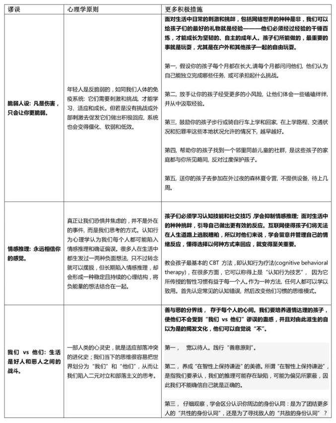 以上三種謬誤已經(jīng)在許多大學(xué)校園內(nèi)開(kāi)花結(jié)果,但追根溯源,它們起始于更早的中小學(xué)教育,甚至兒童期的成長(zhǎng)經(jīng)驗(yàn):安全主義的盛行、“直升機(jī)父母”的過(guò)度保護(hù)、無(wú)監(jiān)督玩耍的減少導(dǎo)致了心理問(wèn)題的爆發(fā)式增長(zhǎng)、自殺率的增加、思想極端、成熟期推后、抗壓性減弱、難適應(yīng)社會(huì)等等。在美國(guó),它們也已經(jīng)從校園蔓延至公司世界和公共領(lǐng)域內(nèi)。它們還從美國(guó)大學(xué)向外擴(kuò)展,在整個(gè)英語(yǔ)世界的大學(xué)里抬頭。