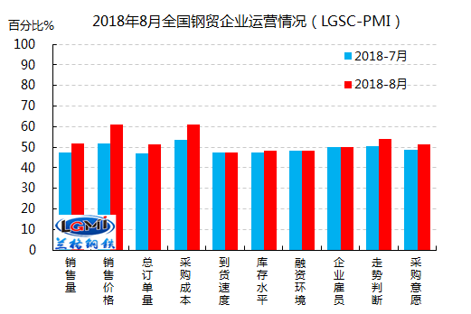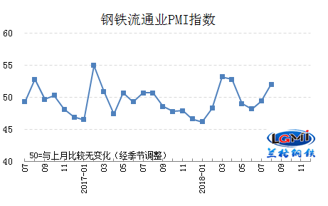 蘭格鋼鐵云商平臺(tái)統(tǒng)計(jì)發(fā)布的2018年8月份鋼鐵流通業(yè)PMI總指數(shù)52.0,較上月上升2.6個(gè)百分點(diǎn)。本月構(gòu)成鋼鐵流通業(yè)PMI的10項(xiàng)分指數(shù)8升2降。調(diào)查結(jié)果顯示,8月份鋼鐵流通企業(yè)銷量、訂單量回升,企業(yè)對(duì)后市信心增強(qiáng),采購(gòu)意愿增強(qiáng),預(yù)計(jì)9月份鋼鐵流通市場(chǎng)需求景氣回升。