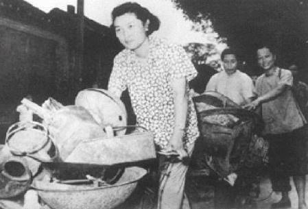 為了增加煉鐵原材料,北京居民響應(yīng)號(hào)召,把自家的鍋盆等金屬用器送去煉鐵。
