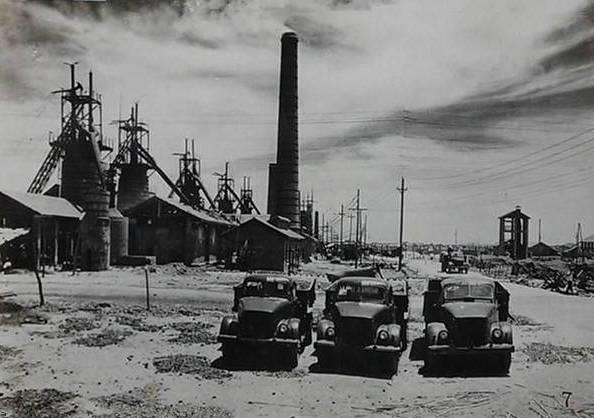 河南新安縣紅旗人民公社鋼鐵基地的高爐群。
