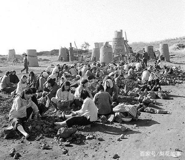 1958年10月14日,河南省寶豐縣響應(yīng)黨中央關(guān)于全民煉鋼的號(hào)召,在全縣掀起大煉鋼鐵的運(yùn)動(dòng)。圖為該縣郊區(qū)的農(nóng)民正在土高爐群旁敲碎礦石。