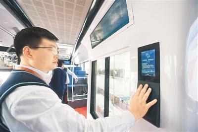 2019中國(上海)國際技術進出口交易會上,工作人員在智能熊貓巴士上演示利用掌脈進行購物。龍 巍攝(人民視覺)