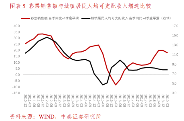 從2018年開始,城鎮(zhèn)居民可支配收入增速無法解釋彩票銷售增速的變動。在2015年之前,城鎮(zhèn)居民可支配收入與彩票銷售額之間,有著一定的同步特性,尤其是在2015年城鎮(zhèn)居民人均可支配收入較彩票銷售收入提前了兩個季度見底。