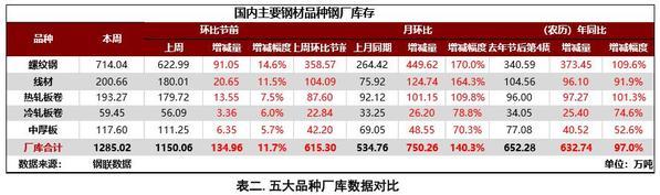 據(jù) Mysteel 統(tǒng)計,本周五大品種庫存總量為 3430.43 萬噸,環(huán)比節(jié)前增加 1719.58 萬噸。上期庫存總量為 2613.34 萬噸,環(huán)比節(jié)前增加 893.76 萬噸。本周五大品種總庫存持續(xù)增加。高于去年農(nóng)歷同期 909.49 萬噸。今年 日均累庫速率為 61.10 萬噸/天,較去年同期增 14.28 萬噸/天。其中長材累庫速度要高于板材累庫速度。分品種看, 螺紋、線材、熱軋板卷庫存增幅較大。