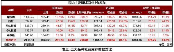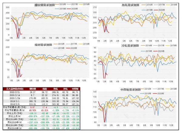 2、 需求方面,本本周五大品種消費量較節(jié)前(2020.1.24)相比分別減少 156.31 萬噸、62.49 萬噸、46.41 萬噸、14.03 萬噸和 10.77 萬噸,比 2019 年節(jié)后第 4 周(2020.3.1)消費數(shù)據(jù)相比,五大品種消費量分別減少 249.41 萬噸、99.22 萬噸、63.91 萬噸、16.06 萬噸和 28.19 萬噸??傮w來看,當(dāng)前受庫存持續(xù)回升,供應(yīng)再度收縮影響,消費量較上周相比除螺紋鋼和線盤,其余品種仍有下降。據(jù)了解,浙江、福建、江蘇等省政府均發(fā)出通知,以補(bǔ)貼、包車、包列的形式,幫助駐家辦公的員工回歸工作城市,逐漸恢復(fù)區(qū)域內(nèi)企業(yè)生產(chǎn)狀態(tài),但需要了解的是復(fù)工不等于開工,開工不等于施工,待需求真正有效釋放還需耐心等待。