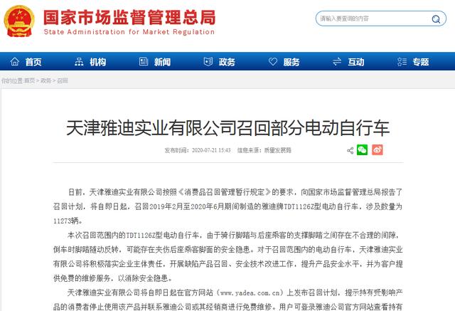 天津雅迪實(shí)業(yè)有限公司按照《消費(fèi)品召回管理暫行規(guī)定》的要求,向國(guó)家市場(chǎng)監(jiān)督管理總局上報(bào)了召回計(jì)劃,即日起,將召回至生產(chǎn)的雅迪牌TDT1126Z電動(dòng)自行車(chē),涉及11273輛。