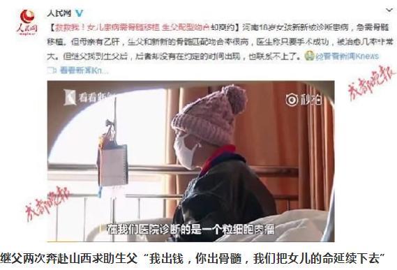 繼父再次努力,求助到了河南當(dāng)?shù)仉娨暸_,通過媒體的幫助,聯(lián)系上了新新生父。媒體工作人員說,新新生父愿意捐骨髓了,但是他有個條件,他要在山西當(dāng)?shù)蒯t(yī)院取出骨髓,不去河南。