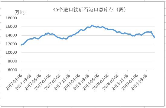 相對期貨而言,現(xiàn)貨依然較為堅(jiān)挺。3月巴西發(fā)運(yùn)受到事故、北部暴雨天氣和澳洲港口颶風(fēng)影響,5月到港水平較低,供應(yīng)仍偏緊。本周,統(tǒng)計(jì)45個(gè)港口鐵礦石庫存13426.51,環(huán)比下降3%,同比下降15.6%,創(chuàng)下一年內(nèi)新低。