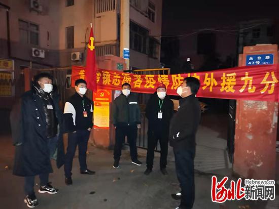 圖為薛超深夜仍堅持工作一線,檢查老舊小區(qū)執(zhí)勤志愿者執(zhí)勤情況,并進(jìn)行看望。