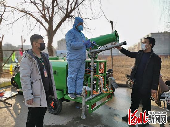 圖為薛超對消殺組人員消毒液配比及設(shè)備使用情況進(jìn)行現(xiàn)場培訓(xùn)。