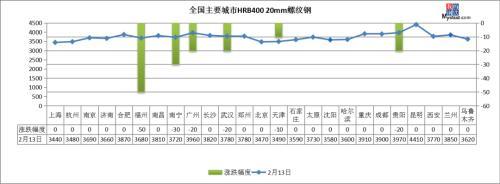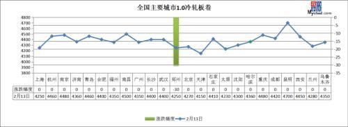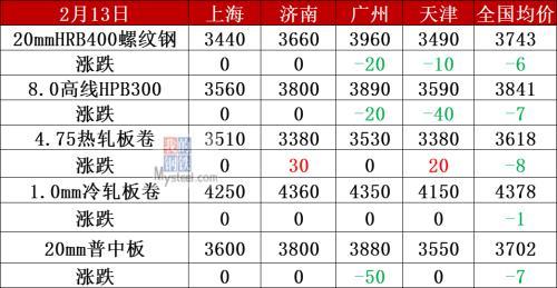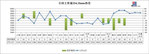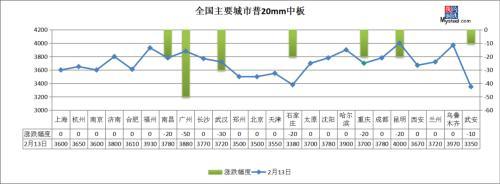 中厚板:2月13日,全國24個(gè)主要城市20mm普板均價(jià)3702元/噸,較上個(gè)交易日下跌7元/噸。其中,南昌、廣州、武漢、石家莊等7個(gè)城市中板價(jià)格下跌10-50元/噸,其他城市持平。